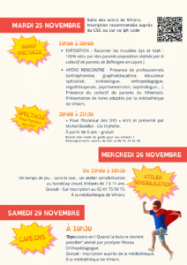 Rencontre libre avec des professionnels (orthophoniste, ergothérapeute, sophrologue, graphoéducatrice, orthopédagogue…. suivi d’un spectacle humour à partir de 6 ans.