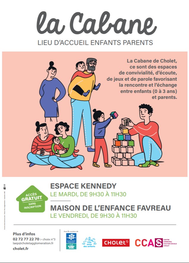 Le LAEP « La Cabane de Cholet », un Lieu d’Accueil Enfants-Parents, ouvre ses portes le 4 novembre. Ce nouvel espace, proposé au cœur des quartiers Favreau et Jean-Monnet est dédié aux tout-petits de 0 à 3 ans, accompagnés d’un parent ou d’un proche, ainsi qu’aux futurs parents, pour un moment de convivialité, d’écoute, de jeux et de parole.