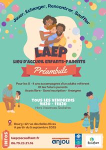 À partir du 1er septembre 2025, la commune d’Écouflant est heureuse d’annoncer l’ouverture du Lieu d’Accueil Enfants-Parents (LAEP) « Préambule », un espace gratuit, confidentiel et convivial dédié aux enfants de 0 à 4 ans accompagnés d’un adulte référent (parent, grand-parent…) ainsi qu’aux futurs parents.