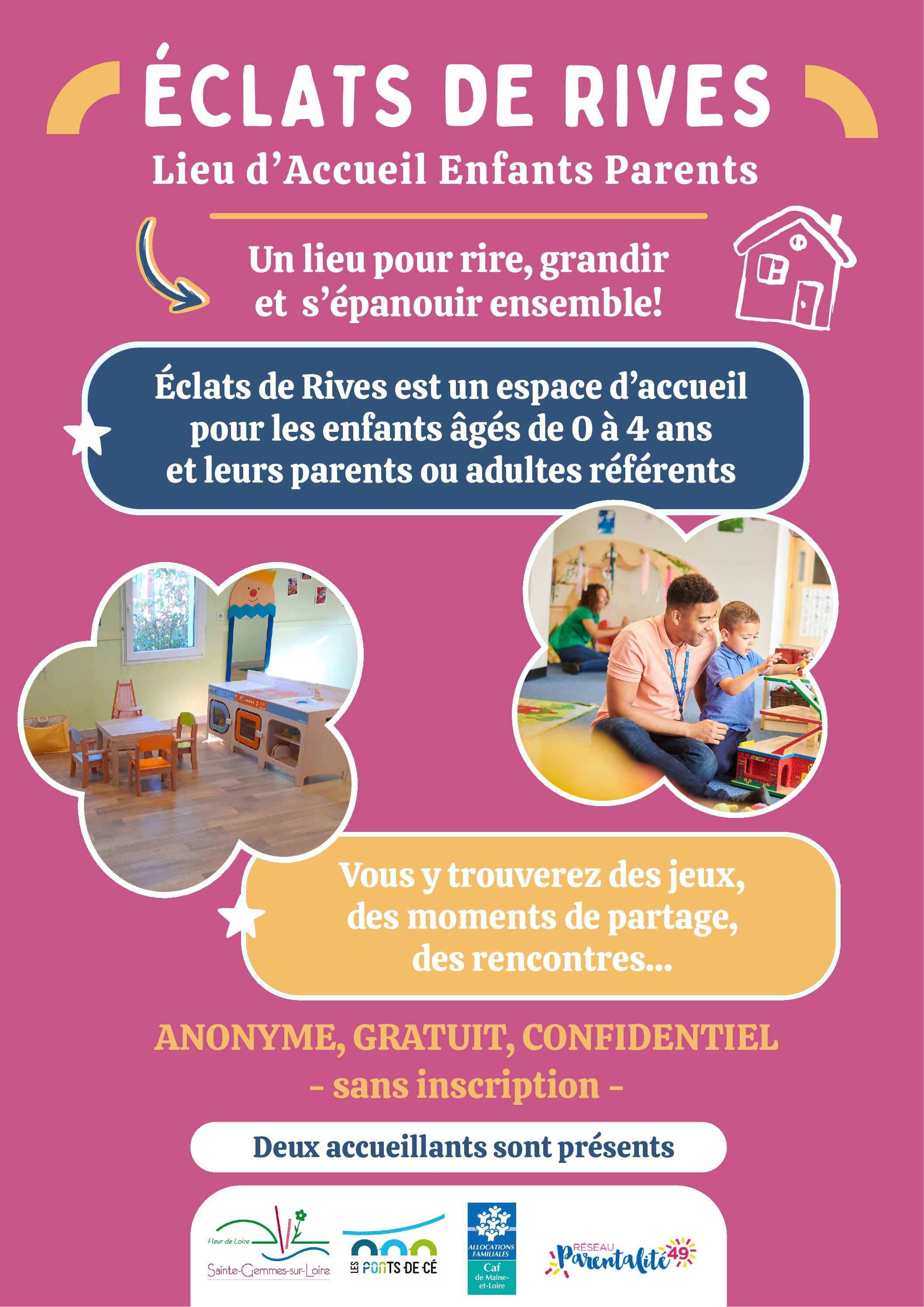 Ce lieu a pour but de proposer aux familles un espace de rencontre entre parents (futurs ou actuels), de jeu avec son ou ses enfants de moins de 4 ans et des échanges avec des professionnels.