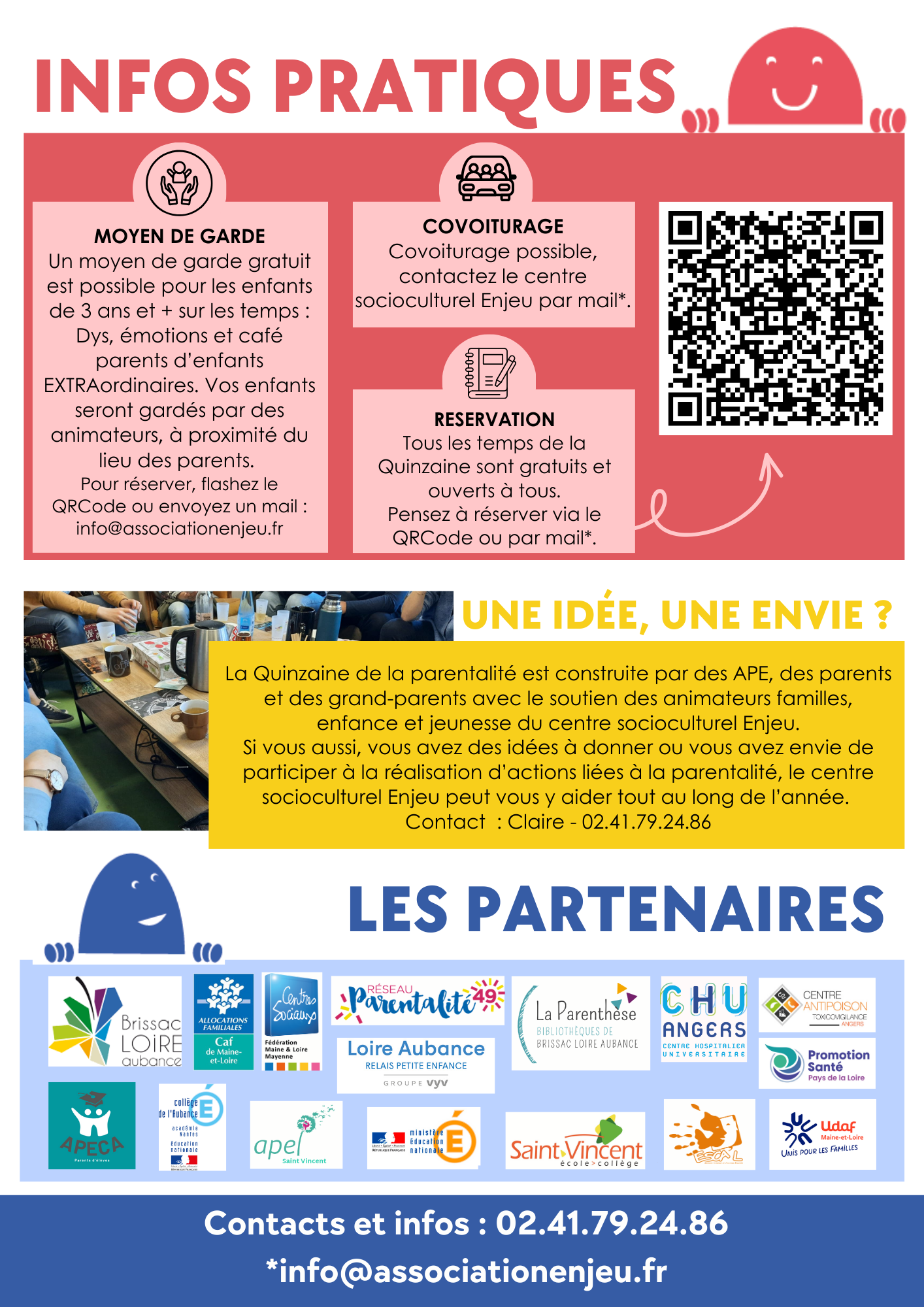 Tous les temps de la Quinzaine de la parentalité sont GRATUITS sur inscription en flashant le code ou par mail : info@associationenjeu.fr.